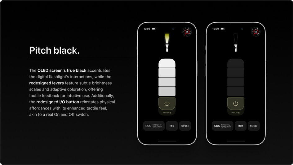 This is a reimagination of what a digital flashlight tool could be if designed with the user at the centre. It was a highly intuitive process to discover what could be better and also more curious and intuitive to manipulate.